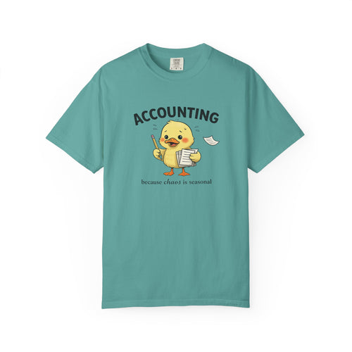 Accounting Duck T-Shirt — "Chaos Is Seasonal" Cute Frantic Paperwork Tee